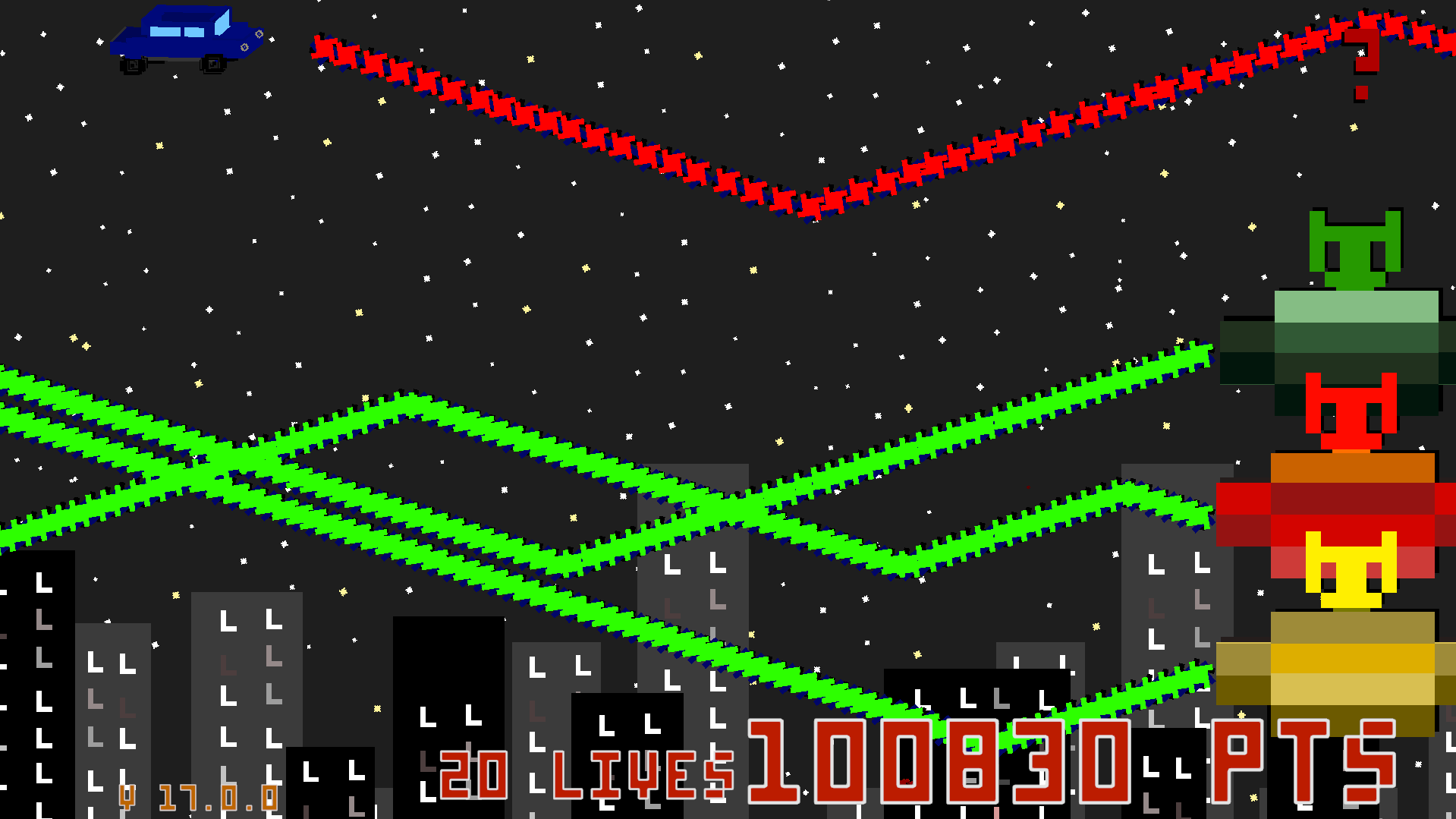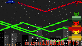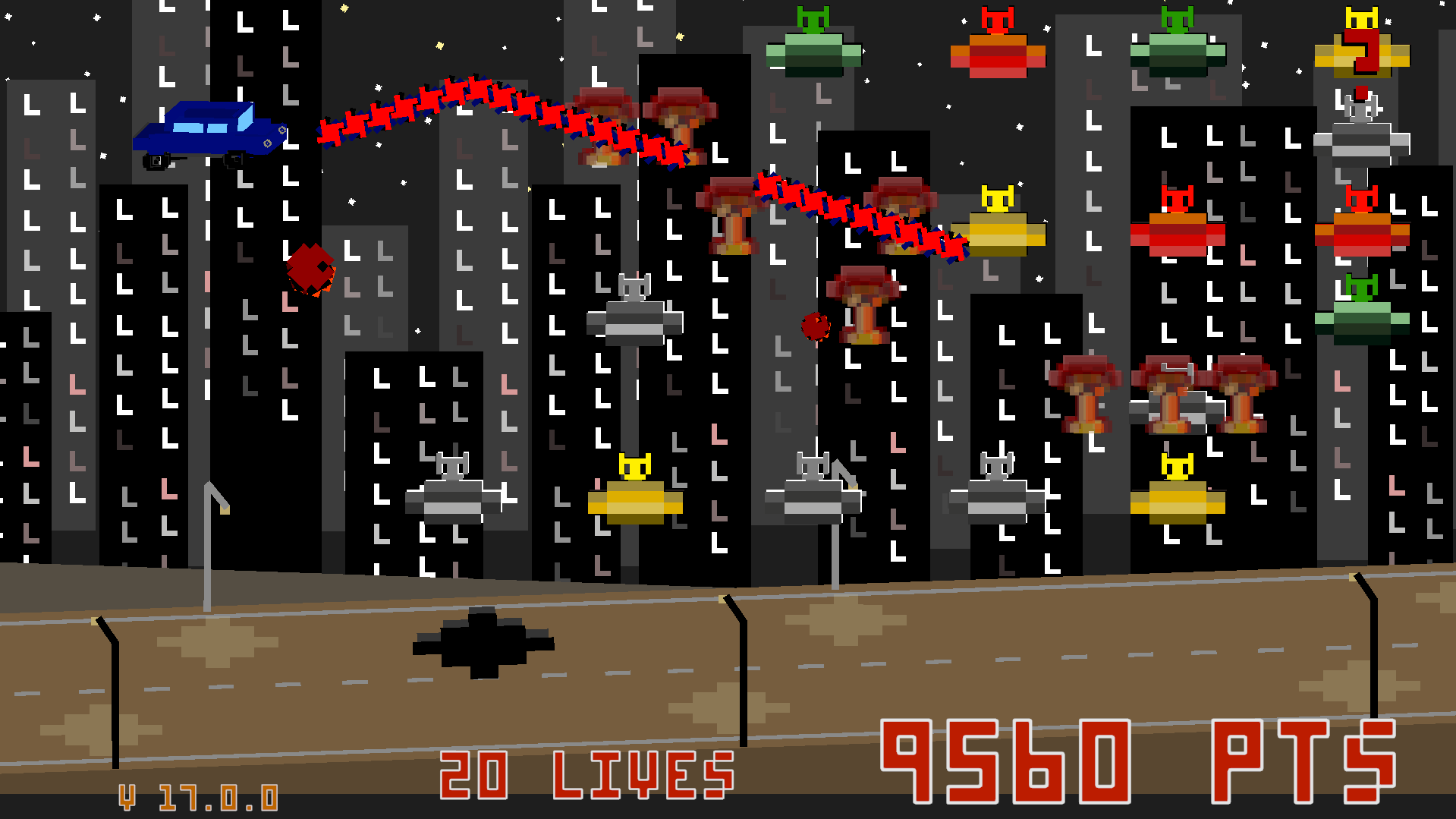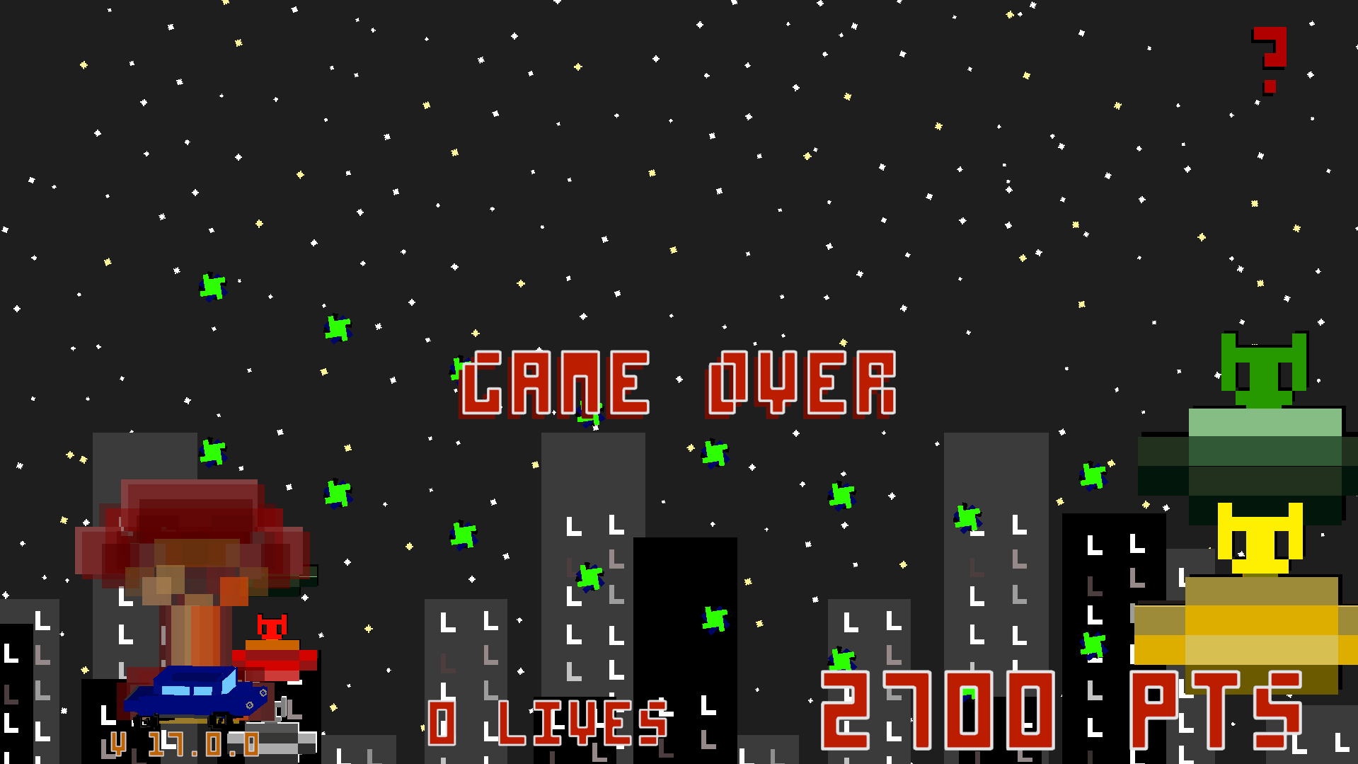 An apocalyptic retro style game about driving and flying where you defend earth from aliens by shooting at them,.